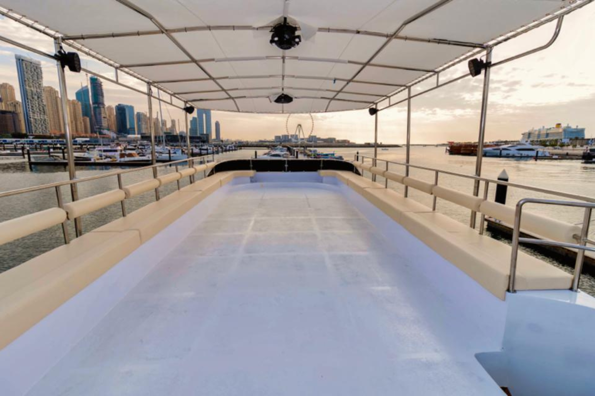 In addition, the 120 FT Lafet Yacht is available with flexible booking options starting from a minimum of two hours. This allows guests to plan short marina cruises or extended private events while exploring Dubai’s popular yacht cruising routes.