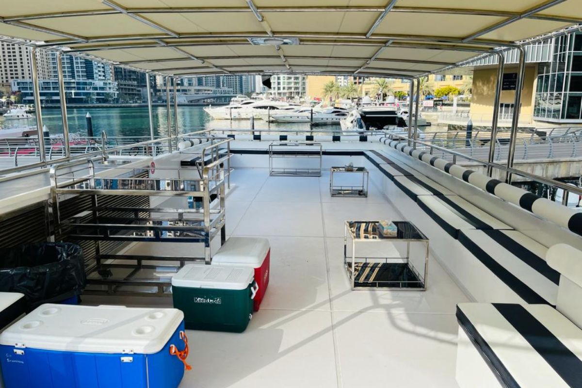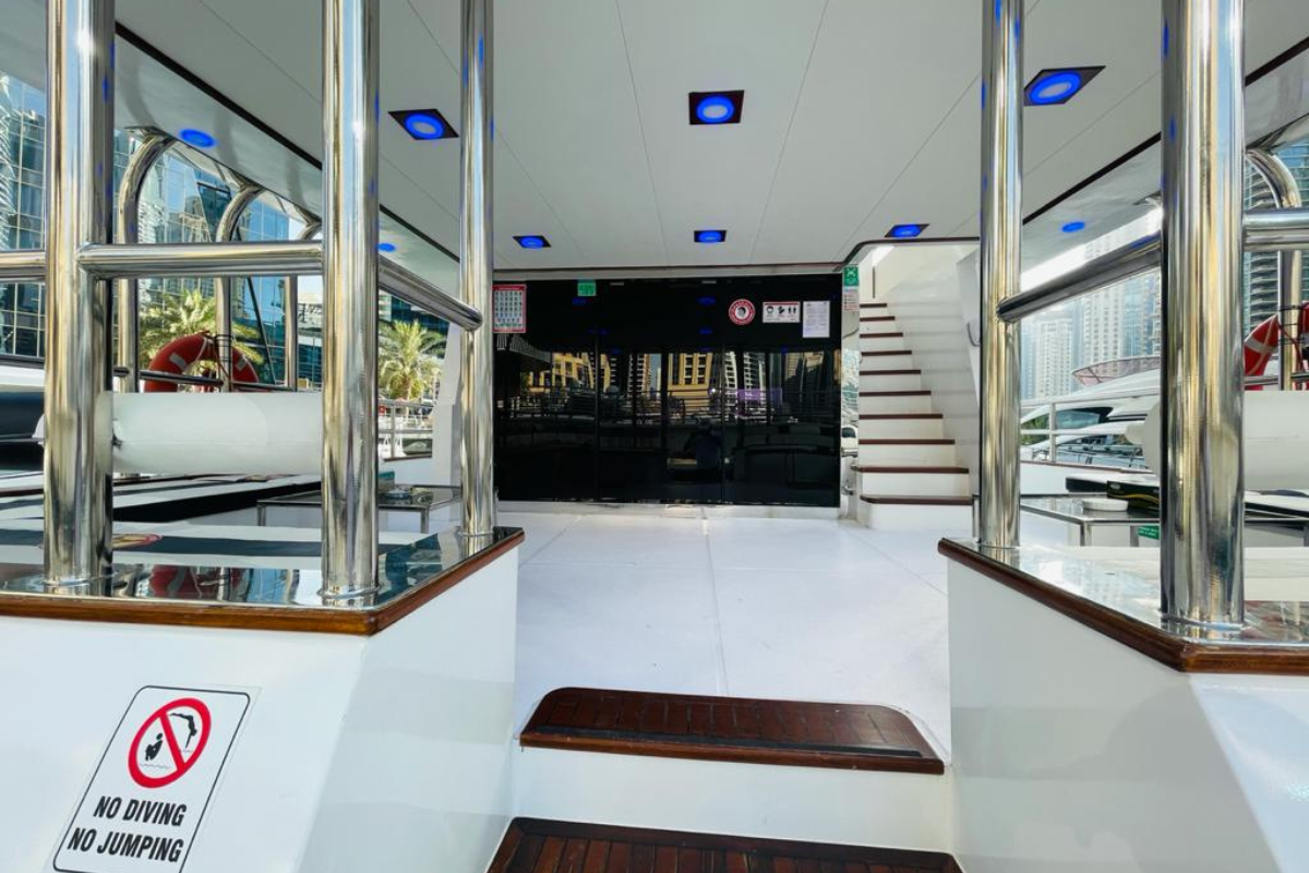 This private yacht rental in Dubai offers wide deck areas, shaded seating, indoor lounge space, and a smooth cruising experience. With a professional captain and experienced crew onboard, guests can relax while enjoying Dubai Marina views, skyline cruising, and open-sea moments.