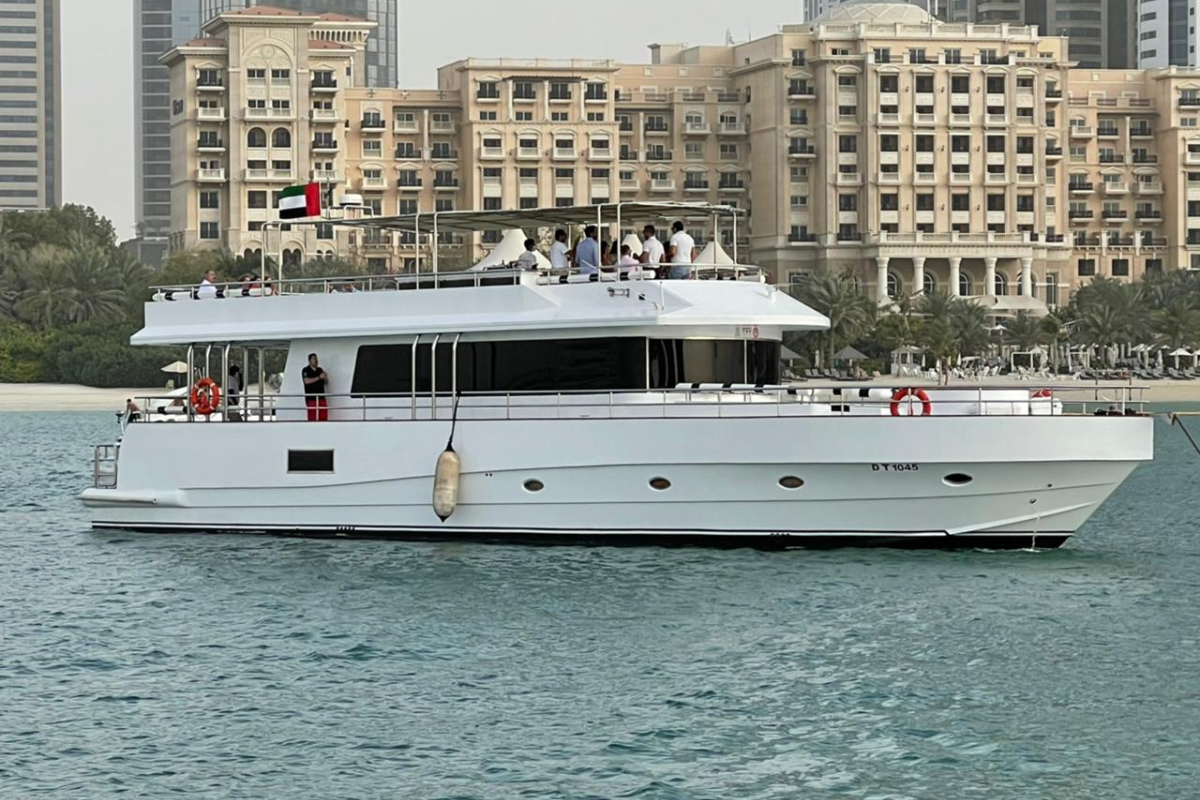 Luxury 95 ft Apolo yacht for private charters, events, and large group cruising in Dubai Marina.