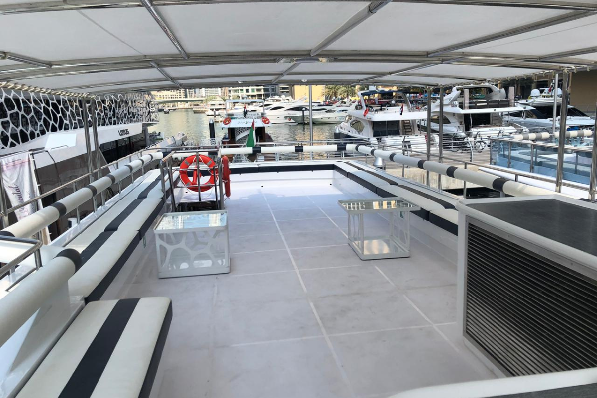 Moreover, the yacht features wide indoor and outdoor areas that make hosting easy, even with larger guest counts. Guests can enjoy onboard speakers for music, comfortable seating zones, and soft drinks throughout the trip. With a professional captain and crew onboard, your yacht charter experience stays smooth and well-managed from start to finish.